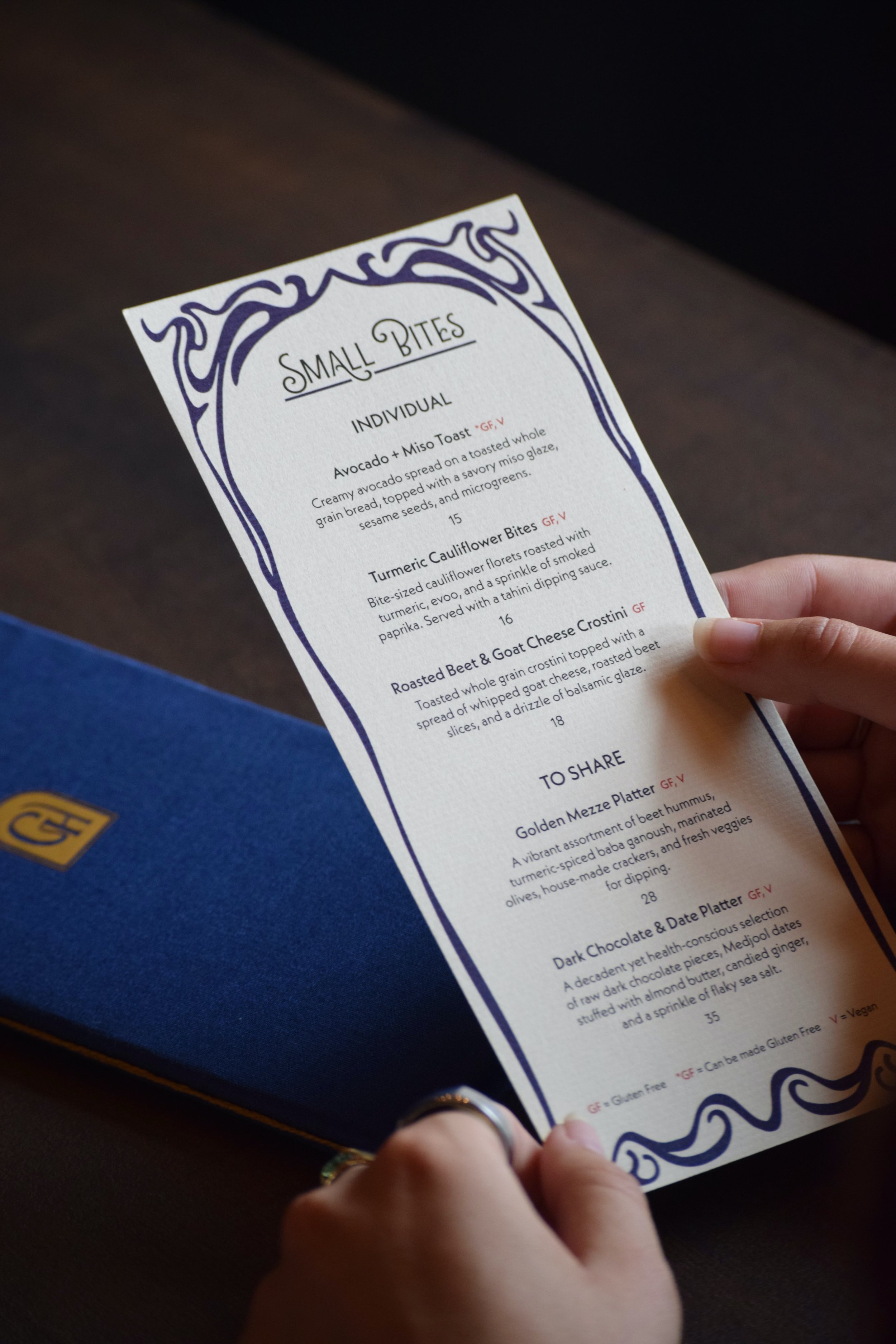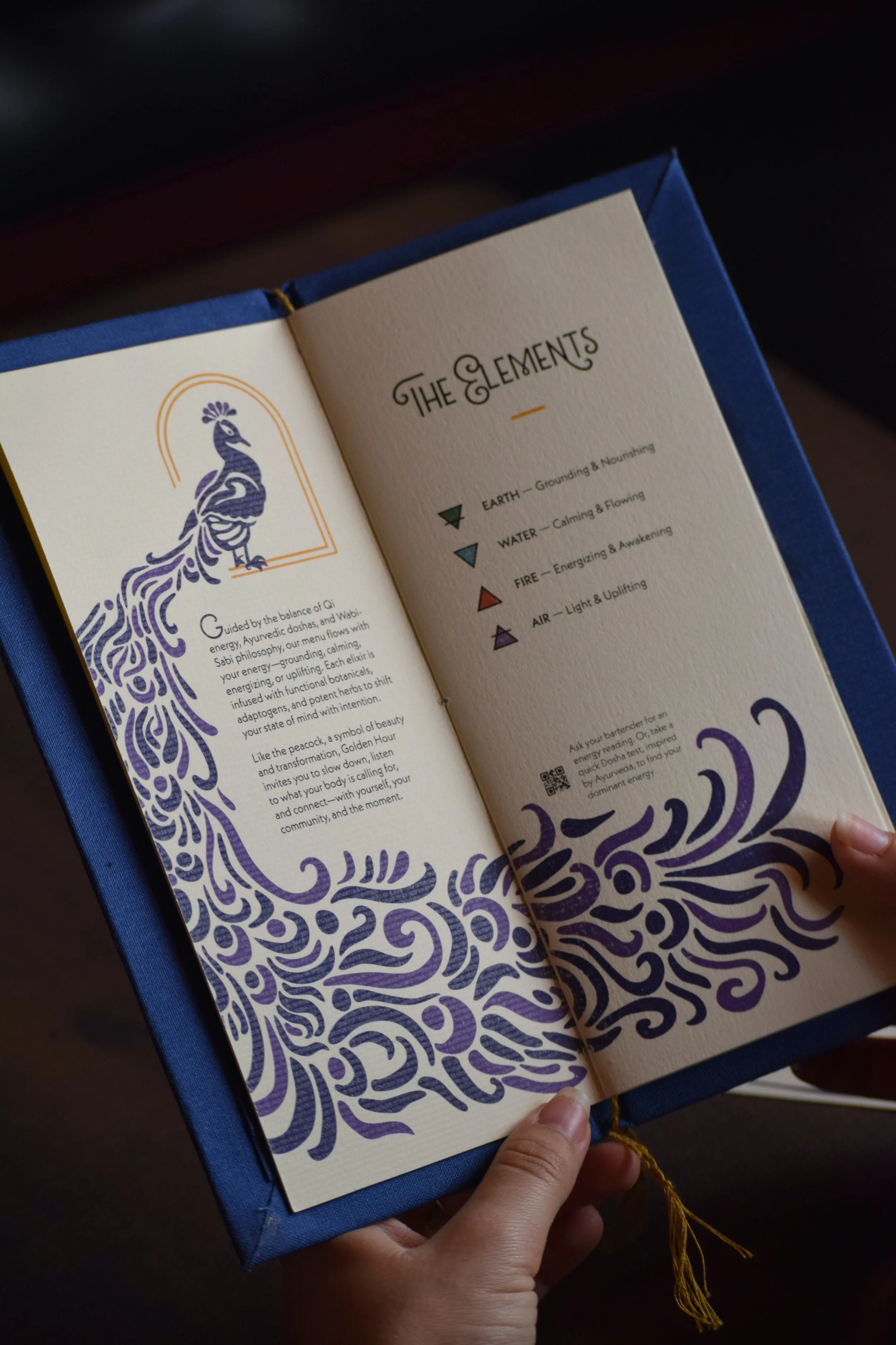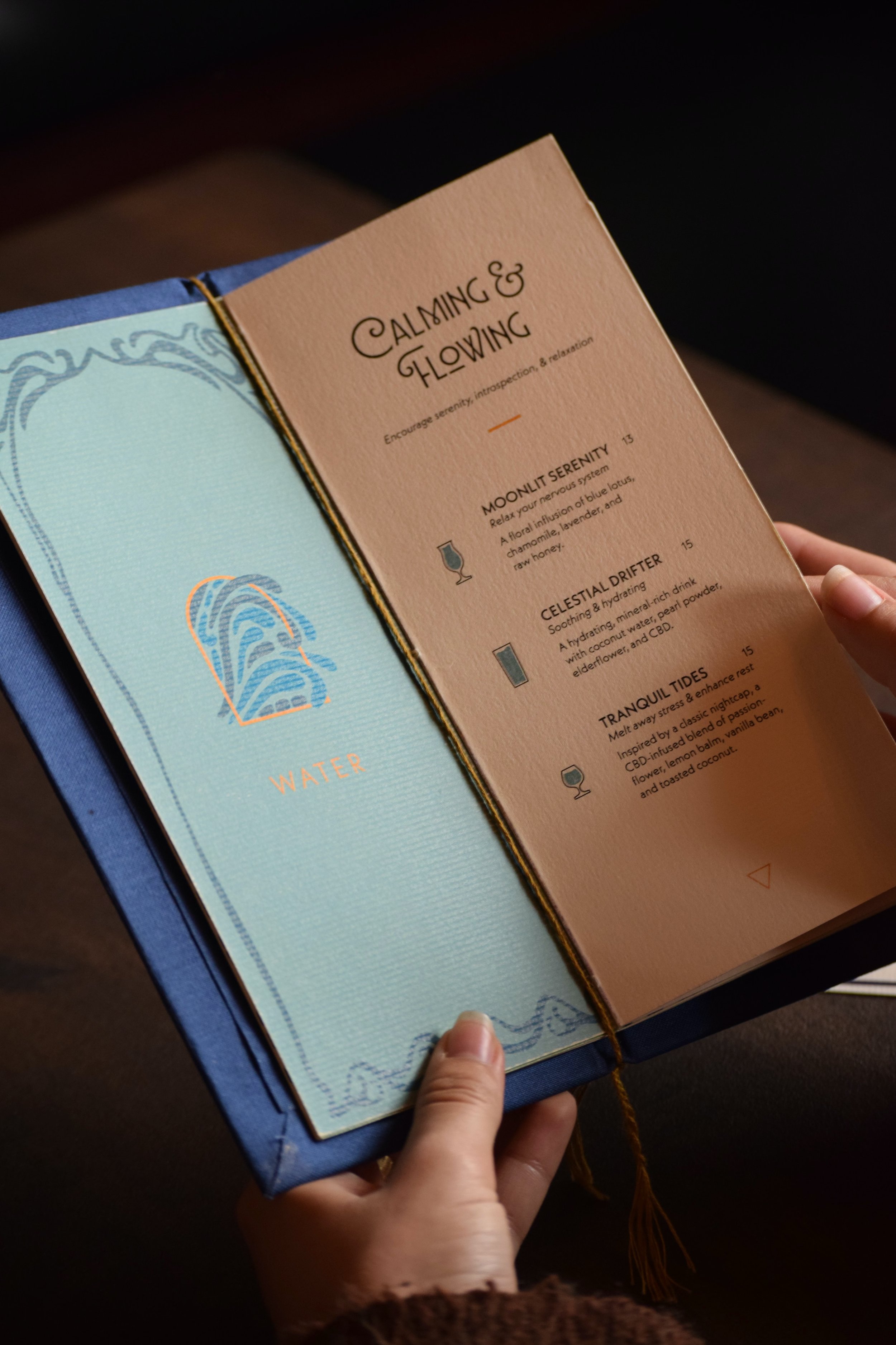 The project responds to the growing demand for sophisticated, non-alcoholic social spaces. The design elevates the menu beyond function, emphasizing ritual, atmosphere, and sensory detail through organic forms, rich color, tactile paper, and gold foil accents to evoke intimacy and quiet luxury. Eastern wellness philosophies inform the menu structure and naming system, creating an experience that feels intentional, elevated, and socially engaging.