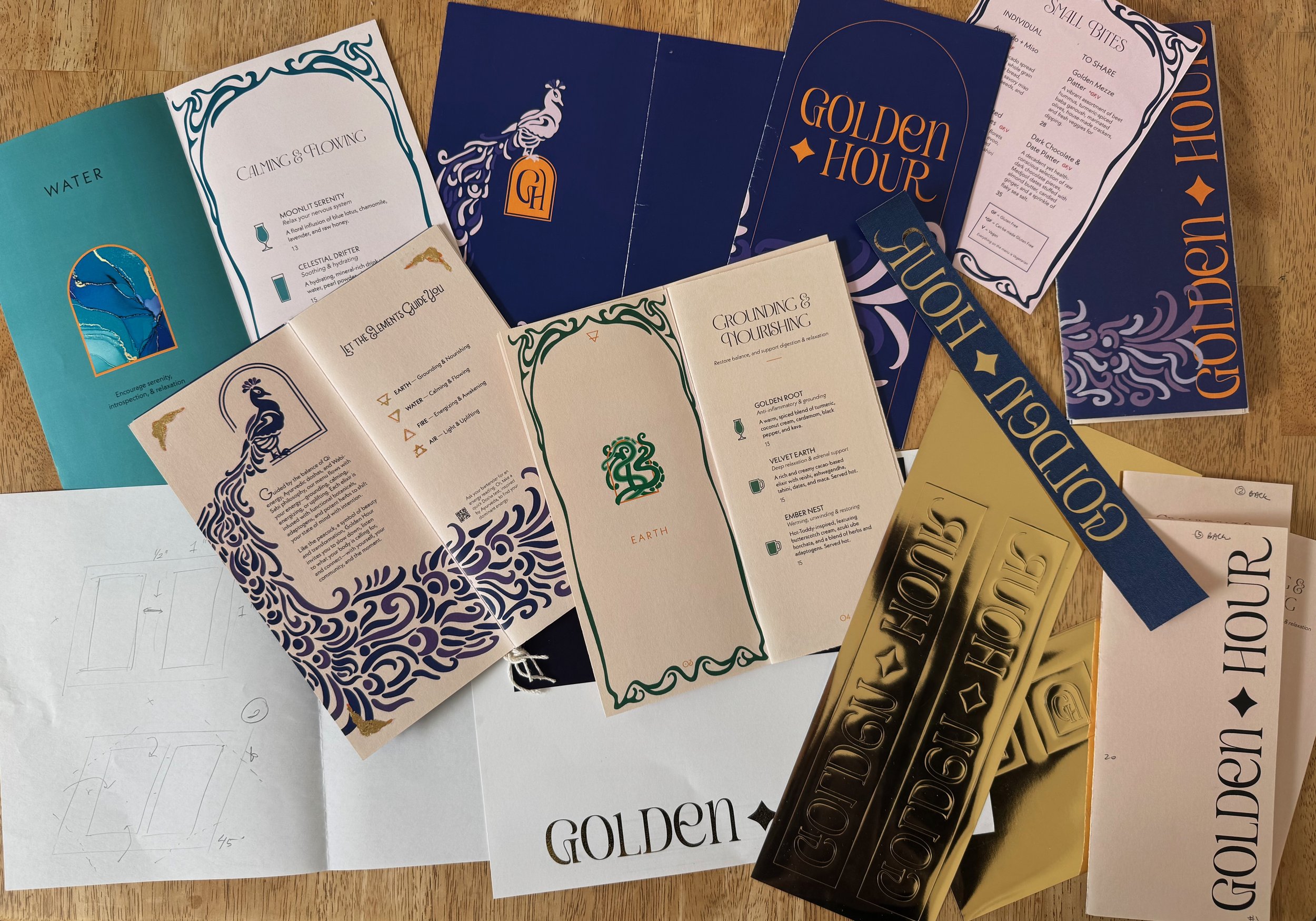Golden Hour is a non-alcoholic speakeasy concept that reframes drinking as a mindful ritual. Botanically driven elixirs support distinct energetic states (grounding, calming, energizing, and uplifting) offering an intentional alternative to conventional nightlife. Inspired by Art Nouveau and anchored by the symbolism of the arch and peacock, the brand centers transformation, presence, and meaningful connection.