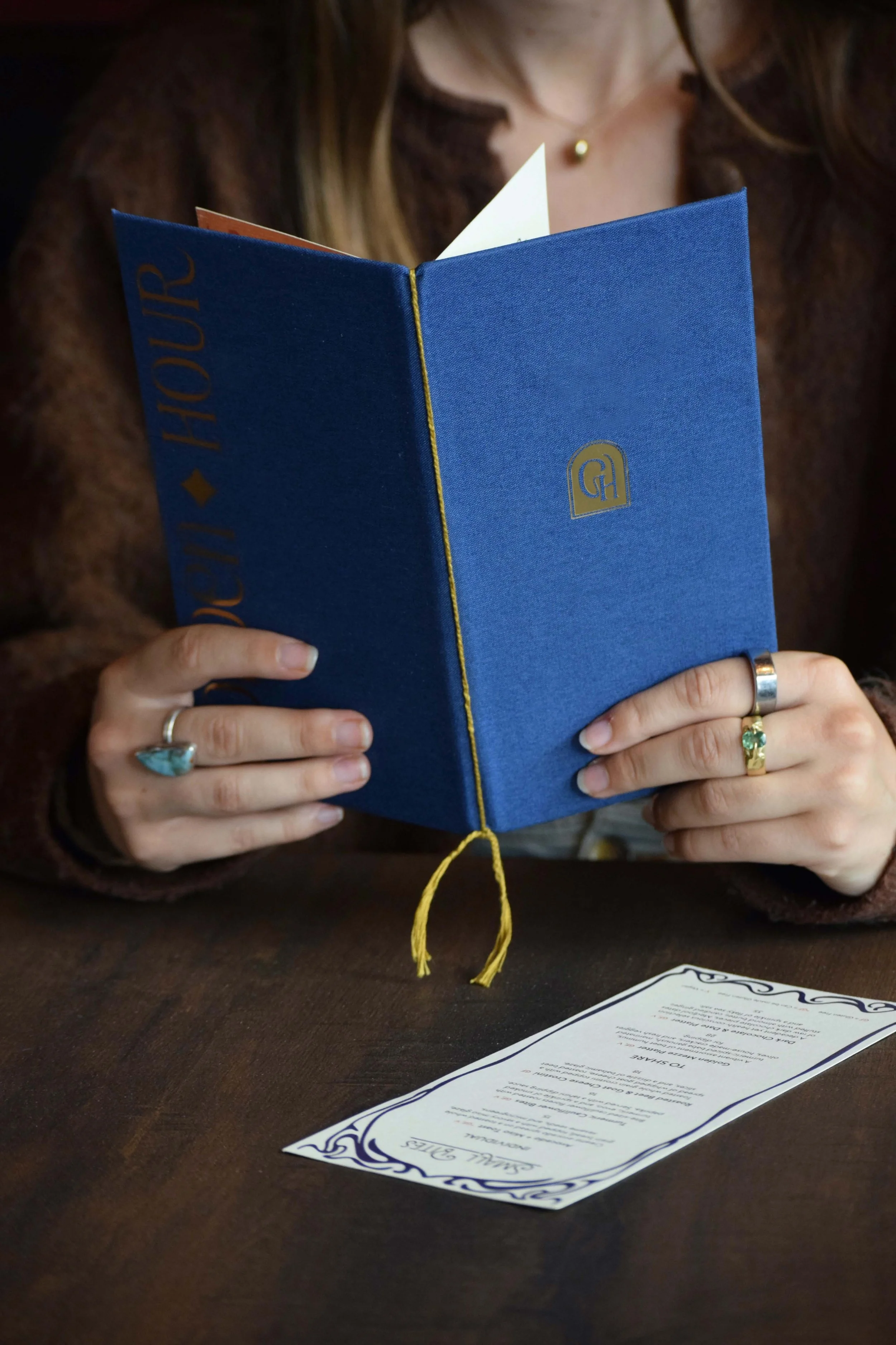 The drink menu was prototyped through several iterations to refine its size, typography, and color palette. I chose a simple saddle-stitch binding structure to keep the pages secure while allowing them to be easily rebound as the menu evolves. Inside the cover, the pages are bound with braided thread, creating a flexible system that allows the pages to be swapped without replacing the entire menu. To produce the cover, I learned to use a Silhouette machine to apply heat-transfer gold vinyl to the fabric. While I initially intended to incorporate gold foiling within the interior pages, production constraints led me to use a yellow-gold tone as a visual stand-in at this time.