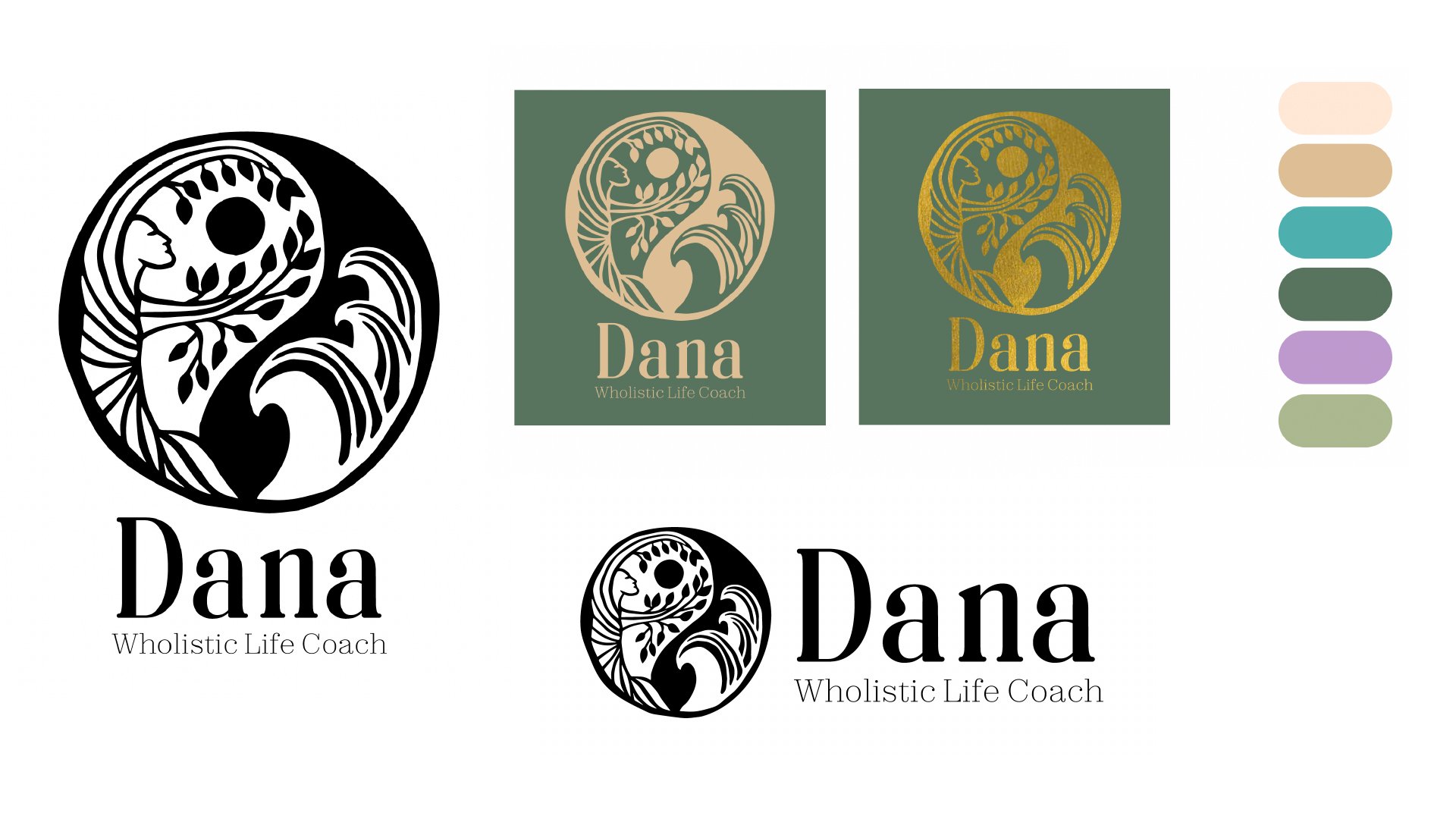 After a couple of rounds of feedback, Dana resonated with the yin-yang concept, so I provided her with three different directions. She wanted to highlight femininity, warmth, and nature in her personal brand. On separate slides, I presented each concept, introducing the color palette to see it in application.